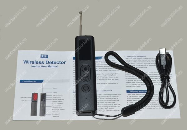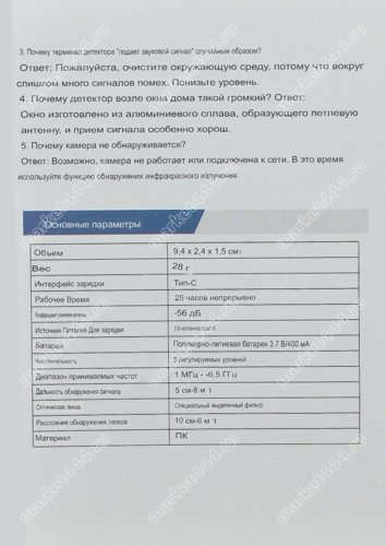 | Режимы работы, поиска | 1) Электромагнитному излучению. 2) Магнитному полю. 3) Визуальный поиск скрытых микро видеокамер при ИК. 4) Фонарик. 5) Противоугонная сигнализация. |
