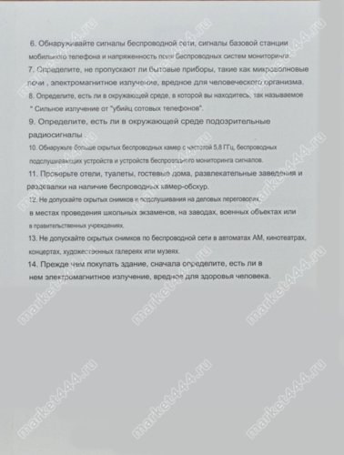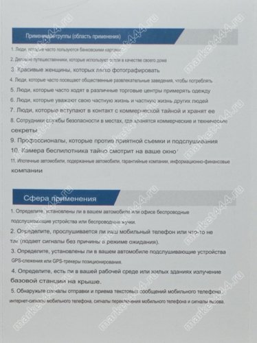 | Технические возможности | Поиск скрытых шпионских мини видео камер, GSM, WIFI прослушки, радио жучков; сигналов и магнитного поля GPS трекеров слежения. |